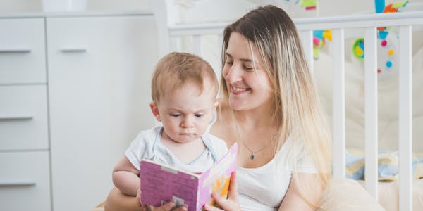 Une assistante maternelle lit un livre à son enfant qui boit dans un biberon.
